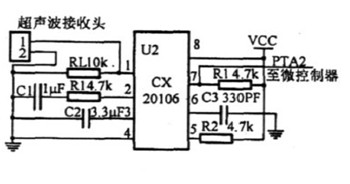 (2)超声波接收电路超声波接收电路如图4所示。采用专用前置放大器CX20106,由前置放大器、限幅放大器、带通滤波器、检波器、积分器、整型电路组成。其中,前置放大器具有自动增益控制功能。超声波信号在空气中传播遇到障碍物后发生反射,回波经接收探头接收并转换成电信号,经条理电缆,输入到微控制器的外部中断口,使计数器停止计数,从而计算出障碍物的距离。