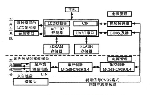 本文提出的可视倒车装置硬件电路框图如图1所示,主要由Intel嵌入式处理器PXA270、视频采集、超声波测距等电路组成。两对超声波换能器、信号调理电路和微控制器完成对障碍物的距离测定,并通过LIN总线发送至车内主系统;摄像头采集到的视频复合信号通过同轴电缆送至视频解码芯片进行A/D转换,并产生YUV422格式的视频信号输入PXA270的快速捕捉摄像头接口;主系统处理器利用字符叠加技术,在TFTLCD屏上将含有障碍物距离等参数的图像信号播放出来。