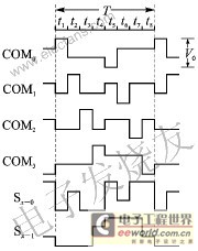 图1为血压计LCD的电极连接结构及等效电路。其中,图1(a)为公共电极连接排列,图1(b)为段电极连接排列。它共有4个公共电极COM0~COM3,每位数码各有2个段电极Sx-0、Sx-1,其等效电路为一个4行×2列的矩阵,如图1(c)所示。