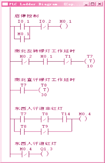 该程序中100.12为控制东西向绿灯的输出变量。该方向的强通通过hr0.00控制,强通按钮按下之后,该变量为1,从而引起100.12输出为1,绿灯亮。强通按钮放开之后,这条通路切断,hr0.01变为0之后,hr0.03会变为1,过程在这里略去。hr0.03所在的通路将产生一个3秒钟的闪烁脉冲。编程者的意图是通过它在结束强通之后制造一个绿灯闪烁过程。然而,由于变量100.12的反馈存在,一旦该变量为1,它将自动地继续保持为1。只有两种方式可以使它恢复为0,一种是30秒定时器到时(tim010),另一个是另一方向的强通信号hr0.01。在同方向强通信号结束之后,一般情况下,上述两个信号均不会转为1,因此绿灯无法马上停止。系统并不产生规定的效果。