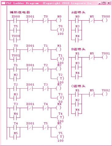 c的喷发受到m1,m2和m3的控制,它们分别控制c组的第一,第二和第三次喷发。在第二次喷发结束之后,m2为0,喷发本应停止,但调试中发现c的输出(y0002)继续为1,单步调试发现, 此时m1为1,由此造成c组输出继续。分析发现,产生m1的梯形图有错。应该使用m1来产生反馈,但程序中用了b组的输出变量y0001。 该变量恰好在c组第二次喷发之后重新置1,因此造成了c组继续喷发。将此处改成m1之后这一错误即可消除。