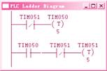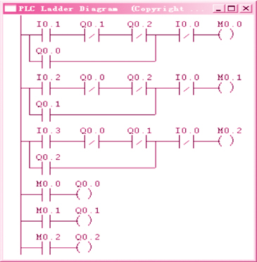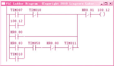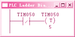 同前一程序相比,这一程序中增加了t0,t1等定时器。定时器用t标识,它的上方是定时器变量名,下方是预定的定时延迟。本例使用的是ton类型定时器,这种定时器只要输入端由0转1计时就开始,在计时过程中,输入端必须始终保持为1,一旦定时器到时,它所对应的变量就立即由0转1。在计时过程中,如果输入端转0,则计时停止,定时器到时之后,只要输入端继续为1,那么计时器变量也继续保持为1,一旦输入变0,计时变量也转为0。本例中的定时器按十分之一秒为单位计时。