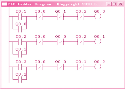 当一个抢答按钮按下之后(比如i0.1=1),对应的输出(q0.0)马上变成1。在下一周期中,即使该按钮方开(i0.1=0)程序的输出依然会保持为0,原因是程序依靠自反馈作用(or q0.0)。同时,由于在另外两个程序段中含有~q0.1,因此它们的输出都无法变成1,直到主持人按钮i0.0把q0.0重新置0为止。