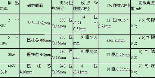 制作RCC型电源关键是脉冲变压器T的绕制。无论何种开关电源脉冲变压器的计算是极繁琐又极不准确的,对业余制作者来说通过估算,实验调整来确定比较实际。即使是估算也涉及磁芯材料,结构的影响,限于目前市场产品参数的离散性,业余者也难以确定,此处只列出部分计算结果供参考。小功率开关电源脉冲变压器制作参数(绕组功能参考附图)如附表所示。