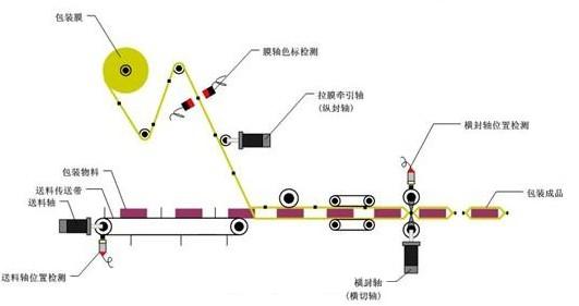 三伺服枕包机是在双伺服枕包机基础上开发的一种高端枕式包装机,其技术核心就是用运动控制器中的电子凸轮功能替代原先的机械凸轮,完成机器中横封横切与拉膜牵引以及送料的配合,要求横切的位置能精确地定位在包装袋的色标上,误差范围应小于±2.5mm(根据色标宽度定),速度一般能达到200包/分钟。