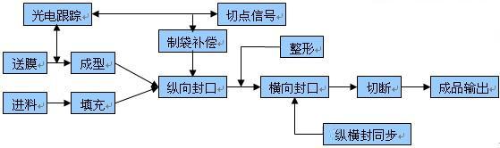 枕式包装机的送膜和进料是同步进行的,由色标检测和接近开关分别对送膜和送料的位置进行检测,薄膜经成型器成型后变为筒膜,并进行纵向热封,同时物料被送进筒膜内,一起向前经过横封横切部位,由回转式或往复式的横封横切刀对筒膜进行横向封切,输出包装成品,具体工艺流程图和工艺结构图分别参照图1、图2:
