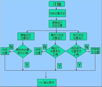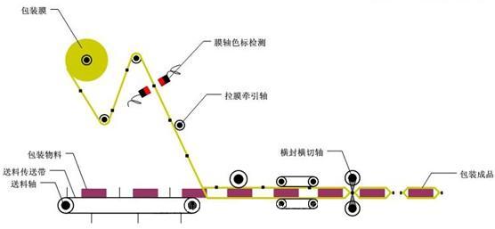 带动包装膜,夹运,纵封轴,使包装膜与包装物同步,当包装薄膜上需要色标定位时,必须在送膜轴的控制中加入纠偏,以防止滑差导致的累计误差,保证横切位置准确如图7: