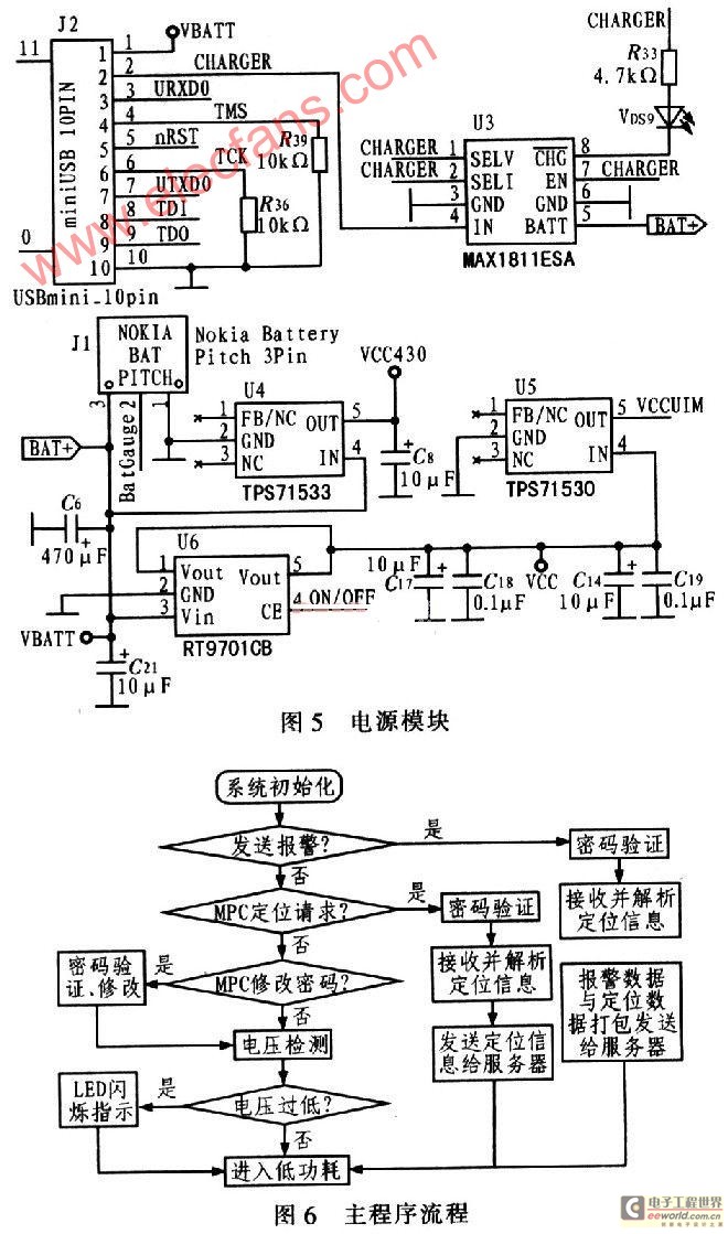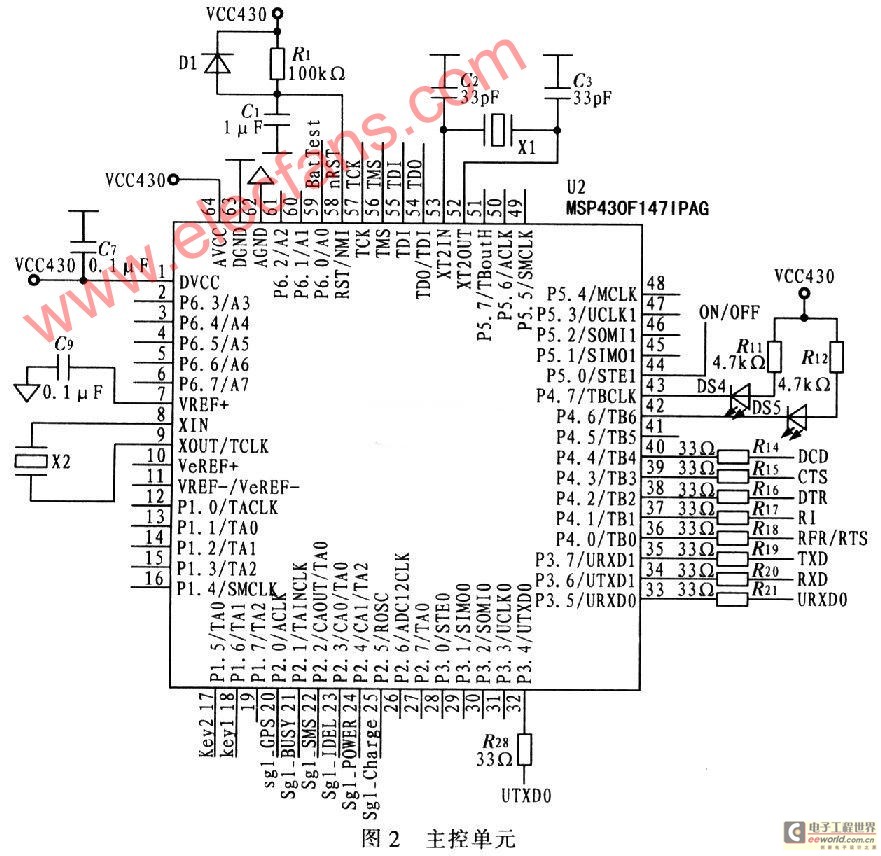 个人定位终端的硬件组成如图1所示。为了解决GPS在室内和高层建筑密集区难以定位的问题,选用AnyData公司的DTGS-800 GPSOne模块;为了缩小体积、降低功耗和成本,主控单元MCU选用超低功耗的16位单片机MSP430F147,显示器选用LED。单片机负责控制 GPSOne模块发起定位请求,接收并解析CDMA网络控制中心发送的信息,获取当前的经、纬度及其他信息,并以短信的方式送至控制中心或操作者的手机。主控单元MCU如图2所示。它包括MSP430F147,外接高速晶振和低速晶振,在不需要高速处理时,可将高速晶振关闭,只使用低速晶振,以降低功耗;MSP430F147有2个串行异步通信接口(USART),其中一个(DCD、CTS、DTR、RI、RFR/RTS、TXD、RXD引脚)接口连接DTGS-800的UAR-T1,另一个(URXD0、UTXDO)接口与PC机的串口相连,供系统调试使用。nRst、MS、TCK、TDI、TD0 引脚连接JTAG插座,用于程序下载和在线调试;keyl和key2引脚分别接"Help"和预留按键。外接的LED DS3和LED DS4分别用指示电池电量不足和DTGS-800与MSP430之间的通信;BatTest用于检测电池电量。