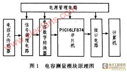 电容测量模块总体设计原理框图如图l所示,包括电源管理电路、PICl6LF874单片机、电容式传感器、信号调理电路、PS021电容数字转化器以及与计算机连接的接口电路。