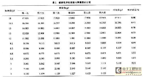 表1反映了被测电容测量值和标称值之间的相对误差,同时也得知被测电容电容值越大,测量值和标称值相对误差越小。由于被测电容受到环境温度、焊锡量多少以及被测电容质量等因素的影响,存在一定的误差。通过多次测量进行平均,以获取更稳定的电容值。在标定好的系统下,对固定电容进行测量来验证测量模块的精确度,测量值和标称值非常接近,可认为被测电容标称值误差较小,进一步得知电容测量模块测量精度较高。