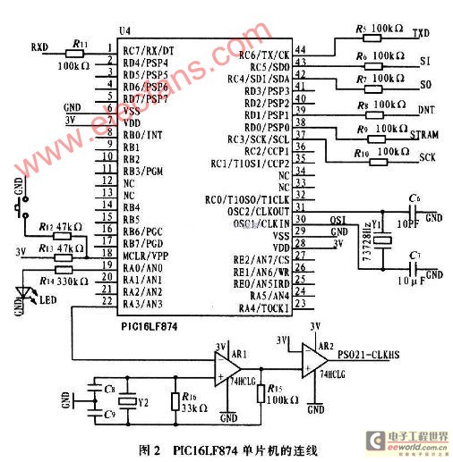 本测量电路需要控制器件来控制数据的读取和写入,选用结构简单,功能强大,并且兼容SPI串行接口的PICl6LF874单片机。由于PS02l的外围接口是SPI,因此单片机能很好的控制PS02l工作,同时测量数据可以通过USART串行接口送入到上位机中。单片机的连接如图2所示,PS02l的连接图如图3所示。