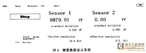 试验中,分别选取1、2、3、5.1、6.8、8.2、9.1、12、13、15、16.5、18 pF的固定电容作为被测电容。根据被测电容的范围确定参考电容的大小,然后根据被测电容和参考电容值,并结合放电时间来确定放电电阻阻值,最后选择适当的测量模式进行测量。在标定好的系统下,在参考端和被测端分别接一只参考电容,此时在数据显示界面显示的值为参考电容值以及寄生电容值的和(图3中 Sensor l显示的数据);然后在被测端参考电容的基础上再并联被测电容,此时测得的数据为被测电容值、参考电容值以及寄生电容值的总和,以上两步所测值相减就是被测的电容值,最后得到的被测电容值统计如表l所示。