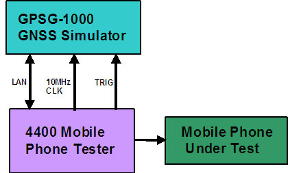 4400使用这三个带有时间标记的文件,产生协助数据,并传送给被测手机。4400通过网口控制GPSG-1000仿真,并通过硬件触发仿真。GPSG-1000的外部10MHz时钟由4400提供,使得射频信号与4400内部用于仿真的数据同步。