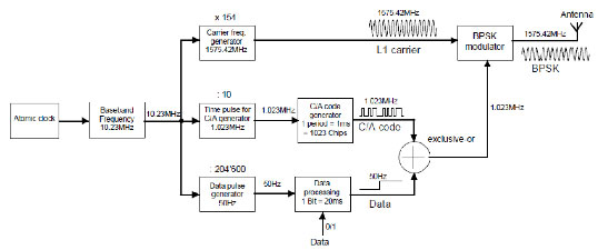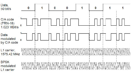 每一GPS卫星发射具有独特编码签名的相同载波信号。此签名由1023位伪随机噪声(PRN)编码构成,以1 ms周期重复发射。PRN码与50bit/s的导航数据异或计算。合成的编码以BPSK方式调制1575.42MHz载波。最终产生扩频信号。