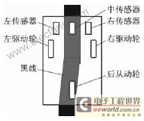 机器人寻迹控制示意图如图3所示,机器人采用前轮驱动后轮辅助的三轮差动式行走方式。车体前部两轮均为主动轮,由两个电机分别驱动,利用它们的转速差来控制机器人运动方向;后轮为从动万向轮,仅起着支撑车体的作用。车底板前部以车体中心线为轴线对称放置着3个自制的红外光电传感器,作为机器人的寻迹传感器。