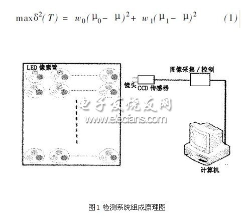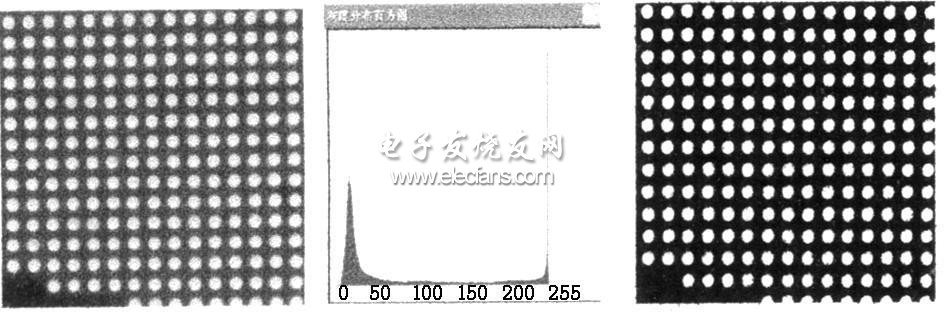 由于LED显示屏的点阵特性,实际检测中发现采集的图像(如图2(a)其灰度直方图(如图2(b))双峰分布特征十分明显。对于这类情况,采用式(1)的最大方差阈值法来自动选择分割阈值,不仅效果好,而且速度快。