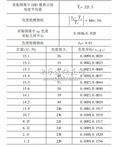 设测得的LED像素点的亮度值为Y1,色度坐标为(r1,g1),分析Y1、(ri,g1)的离散性,就能确定LED显示屏上亮度和色度不一致的LED像素点。