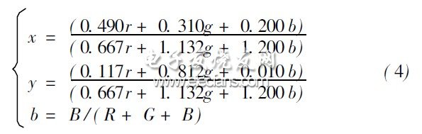 而LED显示屏上的每个像素点总是能在待测图像中找到对应的区域。因此,可通过其对应区域内图像数据中的RGB值来确定该像素点的色度,其计算公式如式(3)。