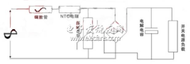 在越来越多的产品要求宽电压、低功耗的时候,开关电源由于其特有的高效率、低功耗的优势,在产品中得到越来越多的应用。可若采用开关电源就势必会使用到电解电容器,而由于电解电容器的充电特性,电压不能发生突变,因此启动瞬间的启动电流非常大,若不采取一定措施(如图6),会导致产品在启动时启动电流过大,严重时会损坏产品。