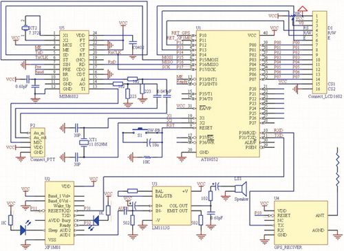 本设计采用AT89S52作为MCU,其中P0口与P1口的2,3,4控制LCD1602;P1口的5,6,7作为同步串口控制调制解调芯片MSM6882;串口的RX接收GPS数据,TX发送语音数据(见图5)。