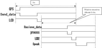 如图4所示,在1秒时隙内,先接收GPS信号(图中GPS表示),经采集后再发送给调制芯片(图中Send_data),然后控制LCD显示(图中LCD),显示完毕后开始等待接收总台命令信号,等待直至下一秒的到来,相隔大约0.6秒。若下一秒到来前没有命令信号则转入下一个循环;若下一秒到来前有接收到命令信号则进入接收程序(图中Receive_data),经过短暂的数据处理时间段(图中process)后再启动显示(图中LCD2),然后驱动语言芯片发音(图中Speak)。成功收到命令信息后,下一周期的“Send_data”将改变前导码以反馈给总台。