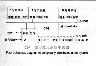 该模式主要特点是以一次主设备如开关、变压器、母线等为安装单位,将控制、I/O、闭锁、保护等单元分散,就地安装在一次主设备(屏柜)上。站控单元(在主控室内)通过串行口(光纤通信)与各一次设备屏柜(在现场)相连,并与上位机和远方调度中心通信。具体实施又分为两种模式:保护相对独立,控制和测量合一,如SIEMENS等公司的产品;保护、控制和测量合一,如ABB,GE,MERLIN GERIN等公司的产品。