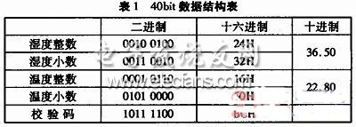 DHT11数字温湿度传感器采用单线双向的串行接口技术,一次通讯时间约4ms,数据分小数部分和整数部分,一次完整的数据传输为40bit,高位在先。即8bit湿度整数数据+8bit湿度小数数据+8bit温度整数数据+8bit温度小数数据+8bit校验码,其中校验数据等于上述4个8bit数据之和所得结果的末8位。例如:读取数据为:湿度为:36.50%;温度为22.80℃,则对应的40bit数据为:0010 0100,0011 0010,0001 O110,0101 0000,1011 1100,其数值对应于温湿度如表1所示。