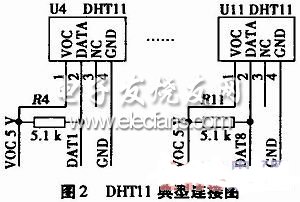 DHT11数字温湿度传感器,是一款含有已校准数字信号输出的温湿度复合传感器。测量范围相对湿度20%~90%RH,摄氏温度0~50℃。传感器包括一个电阻式感湿元件和一个NTC测温元件,并与一个高性能8位单片机相连接。数据接口采用单线制串行接口,信号传输距离可达20 m以上。传感器典型连接方式如图2所示,电源正与地跟单片机电源正和地相连接,8路数据接口分别接5.1 k上拉电阻与单片机P1口连接。
