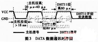 DHT11与单片机主机通讯过程时序如图3所示,总线空闲状态为高电平,主机把总线拉低大于18ms等待DHT11响应,等开始信号结束后,延时等待20~40μs,DHT11然后发送80μs低电平响应信号,然后主机读取DHT11的响应信号,若总线为低电平,说明DHT11发送响应信号,DHT11发送响应信号后,再把总线拉高80μs,准备发送数据,每1 bit数据都以50μs低电平时隙开始,高电平的长短(26μs~28μs表示数字0;70μs表示数字1)决定了数据位是0或1。如果读取响应信号为高电平,则DHT11没有响应,应当检测器件或电路。当最后1 bit数据传送完毕后,DHT11拉低总线50μs,随后总线由上拉电阻拉高进入空闲状态。当用户MCU再次发送一次开始信号后,DHT11从低功耗模式转换到高速模式,等待主机开始信号结束后,DHT11发送响应信号,送出40blt的数据,这是读到的数据为上次测量的数据,要得到实时温湿度数据,必须连续两次读取温湿度值,且第二次读到的值为当前的温湿度值。这一点特别值得注意。