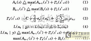 由于需要进行大量的乘法运算和指数运算,Map算法不适用于硬件实现。ERFanian和Pasupanthy最早提出了Map算法在对数域的简化算*og-Map算法。通过转换到对数域运算,避免了指数运算,同时乘法变成加法,而加法则变成Max运算,不过由此也会带来了一定的性能损失。下面简要描述Max-Log-Map算法。设Ak(s),Bk(s),Γk(s)分别代表对数域的前向状态度量、后向状态度量和分支度量,其表达式分别可表示为: