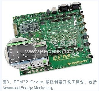 EFM32的开发工具包有一个AdvancedEnergyMonitoring(AEM)系统,可持续测量消耗的电流。这种测量方法是完整的,可准确描绘超时使用的电源,把实际中应用优化为低功率运行(图3)。
