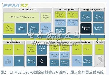 当然,低功耗MCU提供的外围设备功能块需要被刻意设计来用于低功耗操作,而EFM32也不例外。例如MCUsport的8通道12位ADC在全分辨率时使用350?A和1Msamples/1秒的转换率;一个4×4节的LCD控制器只用550nA的sporting集成电压增强、对比度、动画和闪烁功能;而特殊的低能量UART和有32kHz时钟的完整UART,数据传输速度达9600波特时仅消耗150nA。