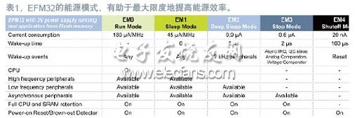 如果要完全控制和真正优化节能,系统设计人员需要灵活选择一些结构良好的能源模式。如表1所示,EFM32提供了几个模式,可让设计人员及时在任何地点使用资源,最大限度地提高能源效率。