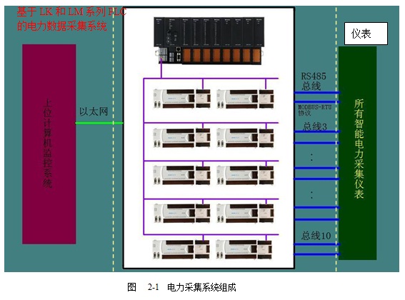 电力采集系统一般由以LK和LM系列PLC为核心的通讯机柜组成。系统装置如图2-1所示。电力监控柜里配置有1套LK系列PLC,10套LM系列PLC及电源。每套LM系列PLC均有一个RS485接口和一个PROFIBUS-DP接口,其通过RS485串口与智能仪表进行通讯,再通过PROFIBUS-DP总线将读上来的仪表数据传送到LK系列PLC中。LK系列PLC通过以太网通讯将汇总的配电室内的所有数据传送到上位监控计算机。