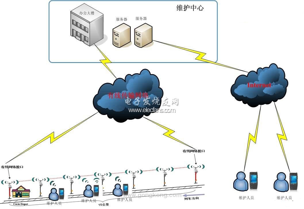 一种就是如上述图左边有线传输网络,其主要指地铁内部无线网,如已存在的PIS无线网,维护系统可以采用已有的网络来进行传输,主要采用的技术为WI-FI技术,特点是传输速度快,如现场照片可以再非常短的时间内传输到维护中心。