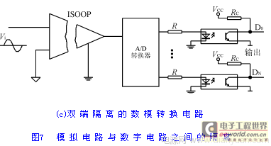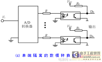 数模转换(D/A)电路的隔离与模数转换(A/D)电路的隔离类似,因而所采取的技术措施也差不多,图7(d)是数模转换(D/A)电路的隔离方法之一。