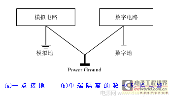 一般地说,模拟电路与数字电路之间的转换通过模数转换器(A/D)或数模转换器(D/A)来实现。但是,若不采取一定的措施,数字电路中的高频振荡信号就会对模拟电路带来一定的干扰,影响测量的精度。为了抑制数字电路对模拟电路带来的高频干扰,一般须将模拟地与数字地分开布线,参见图7(a)。这种布线方式不能彻底排除来自数字电路的高频干扰,要想排除来自数字电路的高频干扰,必须把数字电路与模拟电路隔离开来,常用的隔离方法是在A/D转换器与数字电路之间加入光电耦合器,把数字电路与模拟电路隔离开,参见图7(b)。但这种电路还不能从根本上解决模拟电路中的干扰问题,仍然存在着一定的缺陷,这是因为信号电路中的共模干扰和差模干扰没有得到有效的抑制,对于高精密测量的场合,还不能满足要求。对于具有严重干扰的测量场合,可采用图7(c)所示的电路。在该电路中,把信号接收部分与模拟处理部分也进行了隔离,因为在前置处理级与模数转换器(A/D)之间加入线性隔离放大器,把信号地与模拟地隔开,同时在模数转换器(A/D)与数字电路之间采用光电耦合器隔离,把模拟地与数字地隔开,这样一来,既防止了数字系统的高频干扰进入模拟部分,又阻断了来自前置电路部分的共模干扰和差模干扰。当然,这种系统的造价较高,一般只用于高精度的测量系统中。