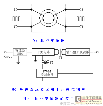 脉冲变压器的匝数较少,而且一次绕组和二次绕组分别绕于铁氧体磁芯的两侧,这种工艺使得它的分布电容特小,仅为几个pF,所以可作为脉冲信号的隔离元件。脉冲变压器传递输入、输出脉冲信号时,不传递直流分量,因而在微电子技术控制系统中得到了广泛的应用。一般地说,脉冲变压器的信号传递频率在1kHz~1MHz之间,新型的高频脉冲变压器的传递频率可达到10MHz。图5(a)是脉冲变压器的示意图。脉冲变压器主要用于晶闸管(SCR)、大功率晶体管(CTR)、IGBT等可控器件的控制隔离中。图5(b)是脉冲变压器的应用实例。