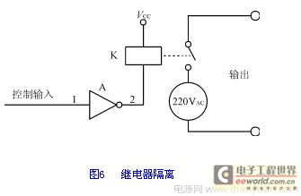 继电器是常用的数字输出隔离元件,用继电器作为隔离元件简单实用,价格低廉。图6是继电器输出隔离的实例示意图。在该电路中,通过继电器把低压直流与高压交流隔离开来,使高压交流侧的干扰无法进入低压直流侧。