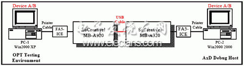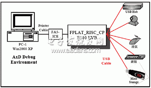 测试方法如下:USB测试Class驱动呼叫由USB IP核提供更高层的API,经USB子系统送出需求到USB设备。接着, 主端经控制端点(Endpoint)接受控制IN/OUT,然后解析/获得回应数据/状况用以核对其正确性。此外, 每个USB设备应该包含几个必需的描述符并依靠所接受的Get_Descriptor需求的内容来回应这些描述符。图3中PC安装Windows 2000或是Windows XP,利用ARM ADS1.2的AxD调试器,FA5 CPU的ICE一端连接PC的打印机口或是USB口,另一端连接开发板,开发板的另一端则是各种USB设备,如USB集线器、摄像头、鼠标、键盘和U盘。