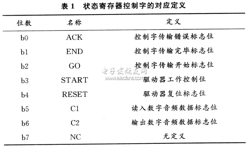 驱动器内部结构框图如图5所示。控制部分提供驱动器与控制器之间的接口(包含有数据总线信号、地址总线信号和控制信号),同时产生控制字转换单元和数字音频接口单元的控制信号;内部寄存器缓存控制字和状态字;控制字转化单元负责将控制字串行发送给WM8731,同时效验传送信号;数据音频接口单元完成WM8731与外部双口RAM的串并转换,实现对数字音频信号的发送和接收功能。