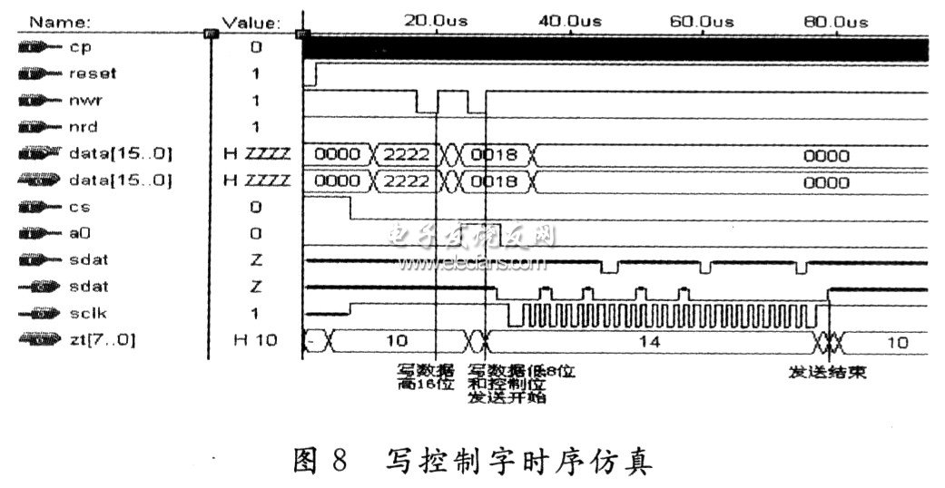 下面给出控制器通过该驱动模块对WM8731写控制字的时序仿真如图8所示。图中各引脚定义如表2所示。