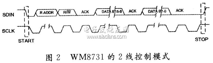 WM8731的控制接口有4根引脚,分别为:MODE(控制接口选择线)、CSB(片选或地址选择线)、SDIN(数据输入线)和SCLK(时钟输入线)。它具有2线和3线两种模式。2线为MPU接口,3线为兼容SPI接口。对控制接口的配置选择可通过设置MODE脚的状态完成。选择MODE为0时为2线模式,1时为3线模式。本文采用2线模式对WM8731进行控制。其时序图如图2所示。