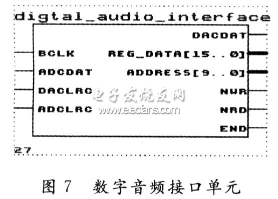 当读入数字音频标志位C1为‘1’,接收WM873l芯片传来的数字音频数据并将其存入外部双口RAM中,当输出数字音频数据标志位C2为‘1’时,将双口RAM中的音频数据发送给wM8731。如图7所示。