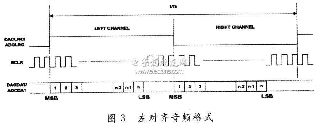本文采用主模式的左对齐数据格式,左对齐数据格式传输如图3:左对齐格式时,MSB在BCLK的第一个上升沿有效,紧接着是一个ADCLRC或DACLRC传输。