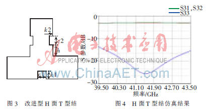 T型接头是一种可用作功率分配/合成的最简单的三端口网络器件,由微波网络理论可知T型结不可能做到三个端口同时匹配,接头处存在与不连续性有关的边缘场和高次模而产生等效电抗。为了减少由波导不连续性导致的失配和损耗,往往在T结中插入金属圆柱或者金属膜片[5-6]。但这种方法设计出的T型结不但工作频带窄,而且调配难度大、加工成本高,因此本文在经过等效电路分析和软件优化之后确定出一种新型的H面T型结,在功分分支底部和共同分支侧边分别加上匹配矩形金属柱,如图3所示。经过仿真优化后得到尺寸为:c1=2.14,k1=1.42,c2=2.3,k2=0.55,h=2.83(单位:mm)。图4是改进型H面T型结的仿真曲线,由图可以看出其具有端口匹配良好、工作宽频带及易于加工等优点。