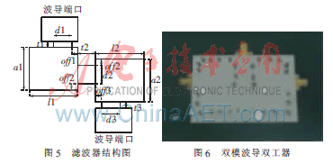 在通道滤波器设计好之后,把它们与上述H面T型结连接起来,得到双工器的总体结构,实物如图6所示。