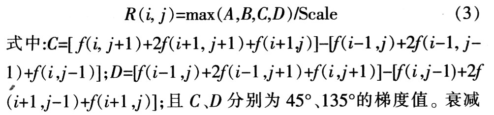 Sobel算子模板中的元素表示算式中相应像素的权重因子。Sobel算子是边缘检测算子,故其处理模板中各因子之和为零。另一方面,由于正因子和负因子之和分别为4和一4,在极端情况下处理结果可能溢出。因此,在实际使用时,Sobel算子通常采用已设定阈值进行二值化,即处理结果得到的是已二值化的边缘图。该结果将导致边缘图中幅值较小的边缘丢失。为了克服这个缺陷,引入一个衰减因子Scale,用它去除计算结果,来消除数据的溢出,而无需二值化处理,而且其结果是无失真的灰阶边缘图,从而保留所有边缘数值同。加入扩展的模板后可得: