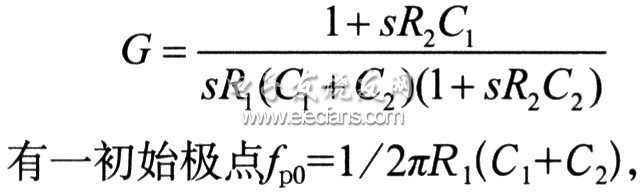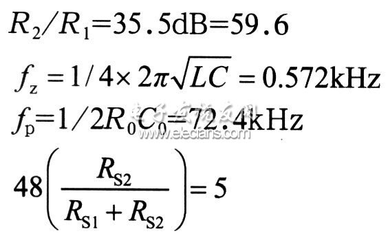 一个零点fz=1/2πR2C1,一个极点fp=1/2πR2C2;设计时,将剪切频率设为1/4开关频率;零点频率设为1/4滤波器谐振频率,增加中频段相位裕度;极点频率设为滤波电容自身容阻频率,增加高频段的衰减。R2/R1设为1/4开关频率处的负增益;RS1,RS2按照采样网络设计,因此: