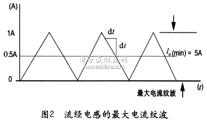 流经滤波电感电流波形如图2所示,纹波电流峰峰值取决于允许的最小电流值,当负载电流小于0.5A时,进入电流断续模式。